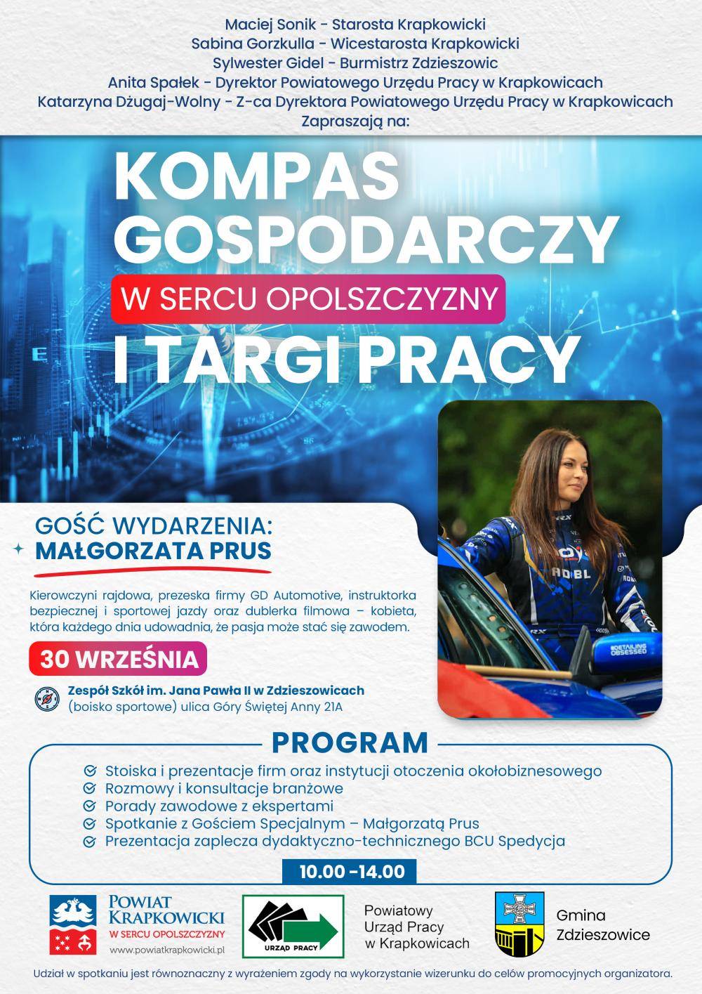 30 września 2025 r. w Zespole Szkół im. Jana Pawła II w Zdzieszowicach odbyło się wydarzenie pod nazwą „Kompas Gospodarczy w Sercu Opolszczyzny i Targi Pracy”. Spotkanie skierowane było do osób poszukujących zatrudnienie, planujących zmienić pracę, a także do młodzieży stojącej przed wyborem ścieżki zawodowej. Uczestnicy wydarzenia mogli skorzystać z porad ekspertów, wziąć udział w konsultacjach branżowych oraz zapoznać się z ofertą lokalnych firm i instytucji. Ponadto zaprezentowano zaplecze nowo otwartego Branżowego Centrum Umiejętności - kształcącego w dziedzinie Spedycji.