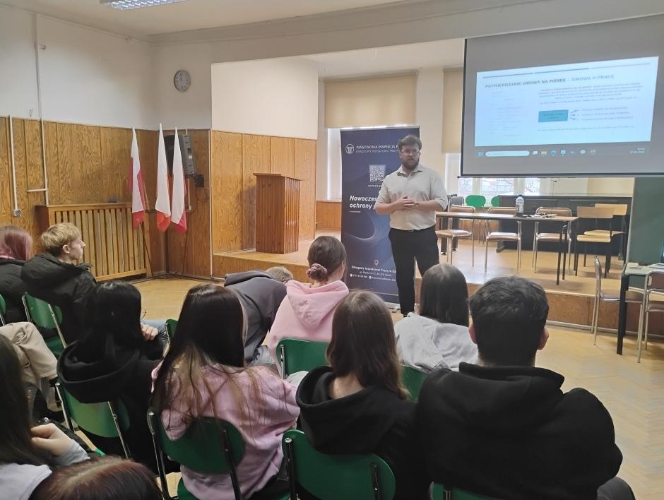 Podczas spotkania z uczniami p rzedstawiciele z Okręgowego Inspektoratu Pracy w Opolu omówili m.in. zagadnienia z zakresu: